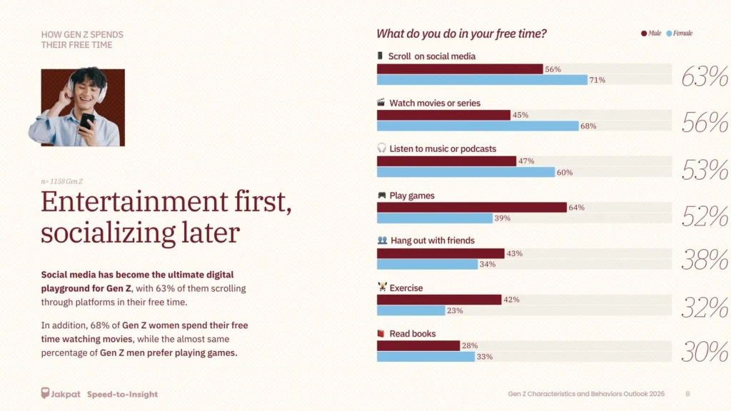 4 Download Report Gen Z Characteristics and Behaviors Outlook 2026 Gen Z is becoming one of the most influential generations today, shaping trends, culture, and the future of work and lifestyle. This report summarizes key insights about their habits, priorities, and concerns. By understanding these patterns, we gain a clearer picture of what Gen Z values and how they make decisions in their everyday lives. This report is based on insights collected from 1,158 Gen Z Jakpat’s respondents. Key research points: To find out about Gen Z behaviors in Lifestyle Consumption habits Mental Health Education and career Finance and investment Here are some previews of the report: How Gen Z spends their free time Where Gen Z spent their time online Table of contents Download Report