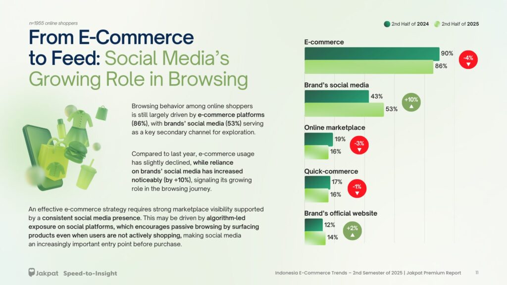 6 Download Report Indonesia E-Commerce Trends – 2nd Semester of 2025 In the second half of 2025, online shopping remains a common part of daily purchasing behavior among Indonesian consumers, covering both essential and non-essential needs. At the same time, consumer behavior continues to shift. Shoppers are becoming more selective in their purchasing decisions, with greater focus on value, practical considerations, and promotional offers. Under these conditions, brands and platforms face increasing pressure to adjust their strategies to maintain relevance in a competitive market. Thus, Jakpat conducted a survey on e-commerce trends in the second semester of 2025 that included 2125 respondents. Key research points: Online shopping behavior Usage of e-commerce and quick-commerce in Indonesia Usage of live shopping and affiliate links as marketing strategies Here are some previews of the report: From E-commerce to Feed: Social Media’s Growing Role in Browsing When to Shop Online Table of Contents Download Report
