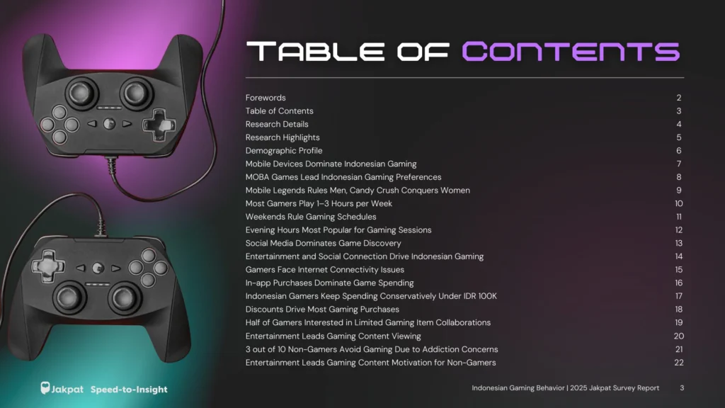 2 Download Report Indonesian Gaming Behavior This survey report shares insights about how Indonesians play and interact with games. It looks at both gamers and non-gamers, showing how they spend money and what shapes their choices. The results highlight differences across age and gender, giving a clear picture of today’s gaming culture in Indonesia. These results are based on a survey conducted on 3rd-4th of September 2025. Research objective: To understand Indonesian gaming behavior, preferences, and spending patterns across demographic segments Here are some previews of the report: MOBA Games Lead Indonesian Gaming Preferences Gamers Face Internet Connectivity Issues Table of Contents Download Report