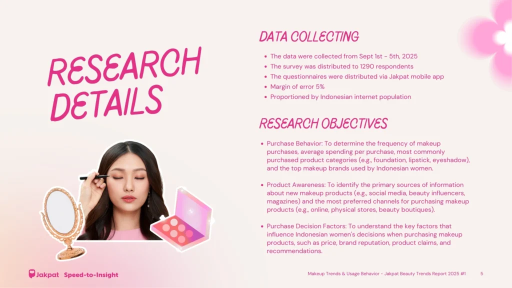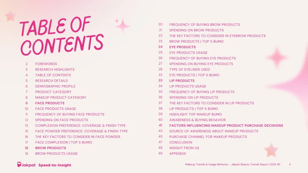 1 Download Report Makeup Trends & Usage Behavior – Jakpat Beauty Trends Report 2025 #1 The Indonesian beauty industry is a vast and fast-growing market with endless beauty possibilities. Jakpat conducted research on beauty trends to uncover key insights and explore emerging trends for 2025. Recognizing the market’s wide potential, we created three seperated comprehensive reports this year, focusing on Makeup, Skincare, and Bodycare. This reports involved 1290 respondents across Indonesia through our mobile app. Discover what the Indonesian market desires, how they allocate their budget for beauty products, and which brands are the most popular among consumers today. Key research points: Market Stability: Makeup usage remains steady year-over-year, signaling consistent consumer behavior across the beauty landscape. Local Brand Dominance: Indonesian local brands continue to lead the market, securing the majority share among users nationwide. Global Competition: Despite strong local dominance, the appearance of select global brands within the most-used list reflects a modest but notable opportunity for international players. Digital Reliance: Brand loyalty is strongly supported by digital touchpoints, which serve as: The primary source of product awareness The main purchase channel across all generations Report series list: Makeup Trends & Usage Behavior – Jakpat Beauty Trends Report 2025 #1 Skincare Trends & Usage Behavior – Jakpat Beauty Trends Report 2025 #2 Bodycare Trends & Usage Behavior – Jakpat Beauty Trends Report 2025 #3 Here are some previews of the report: Table of Contents Research Highlight Research Details & Objectives Download Report